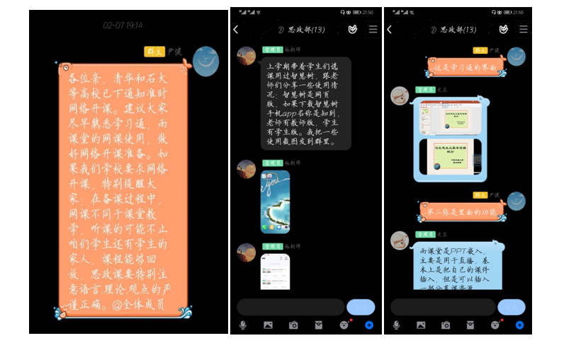 2月7日是正月十四,在网上看到石油大学预计准时开学并启动网络教学的消息后,感觉我们学校也会同步进行,于是先在思政部工作群提前给老师们打了预防针,请大家尽快了解各教学平台的功能和使用方法,为网络授课做准备。2月10日学校启动开学及一系列培训,思政部的老师都认真挑选,比较各平台的使用优缺点,期间组织大家开了2次视频会,了解老师们的开课情况,集思广益,为顺利开课做准备。会后老师们也在群里分享了前期使用学习通、智慧树和雨课堂的经验和感受。