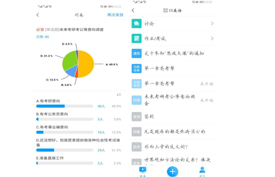 我使用的主要平台是学习通和QQ群,利用QQ群在线视频中屏幕共享的功能可以实现流量高峰期依然能够直播教学,利用学习通进行签到、讨论、问卷调查等互动。开课前首先针对学生专业性质做了问卷调查。数据回收也让我对学生有了比面授更迅捷丰富的了解。